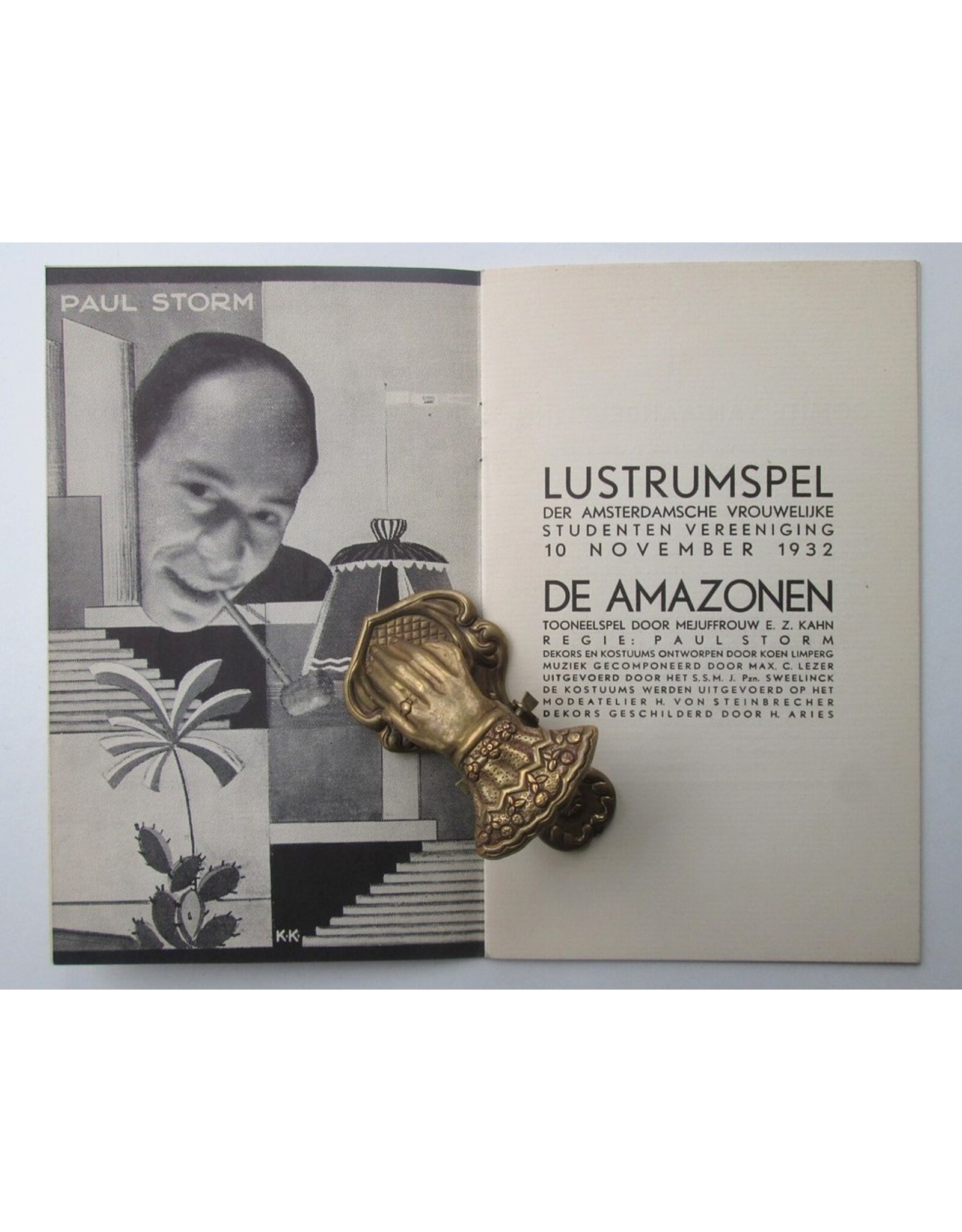 ¶ Achterin is een los programma voor 'De Amazonen' [sic] in geniet omslag (11 x 17,5 cm) met typisch jaren '30 foto-collage frontispice. De regie was in handen van Paul Storm en de kostuums werden ontworpen door Koen Limperg en uitgevoerd door H. von Steinbrecher.