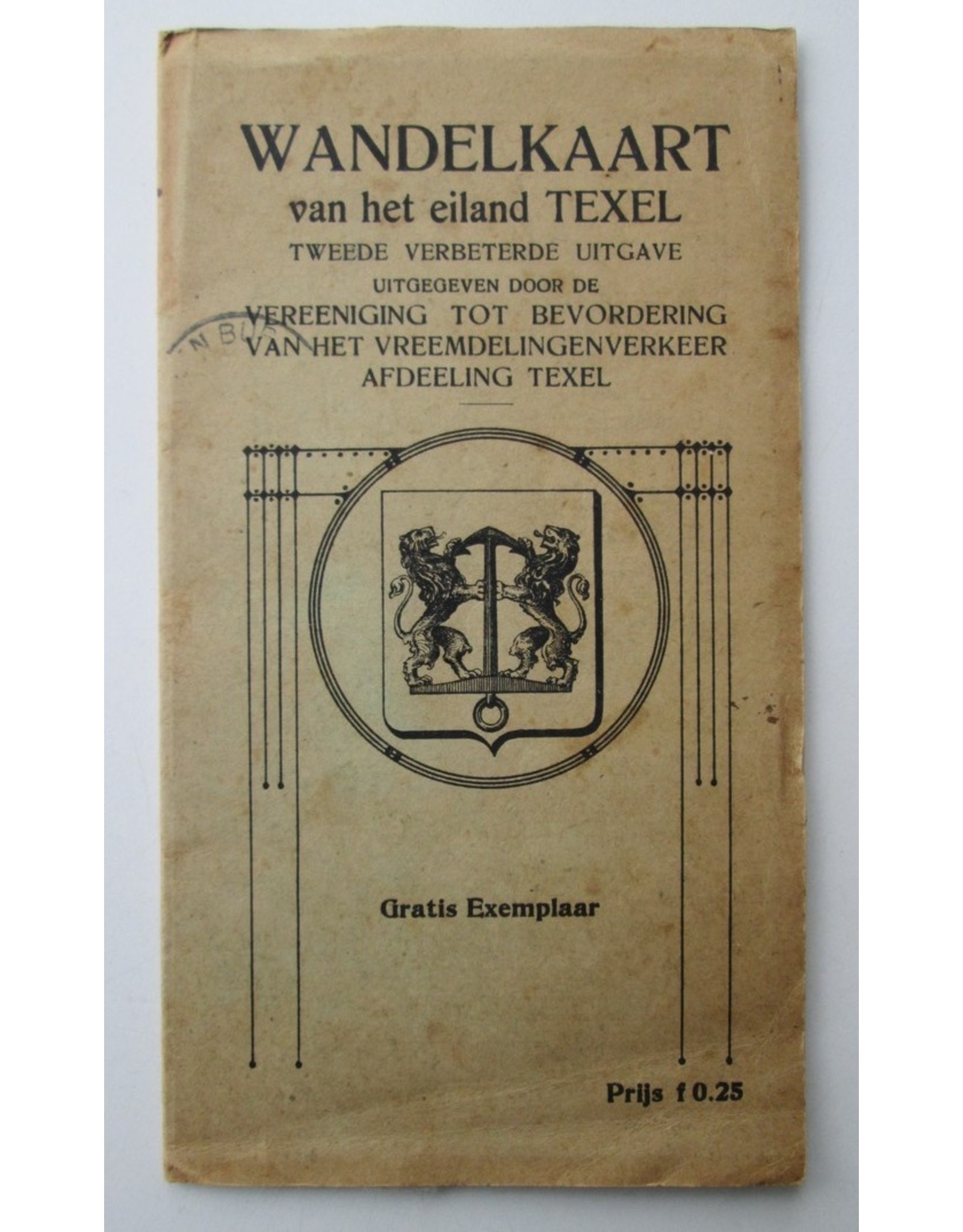 [V.V.V.] - Wandelkaart van het eiland Texel. Tweede verbeterde uitgave - [Den Burg?] - Vereeniging tot Bevordering van het Vreemdelingenverkeer Afdeeling Texel - [ca 1910] - 2e druk - Landkaart in omslag - 11 x 19,5 cm.