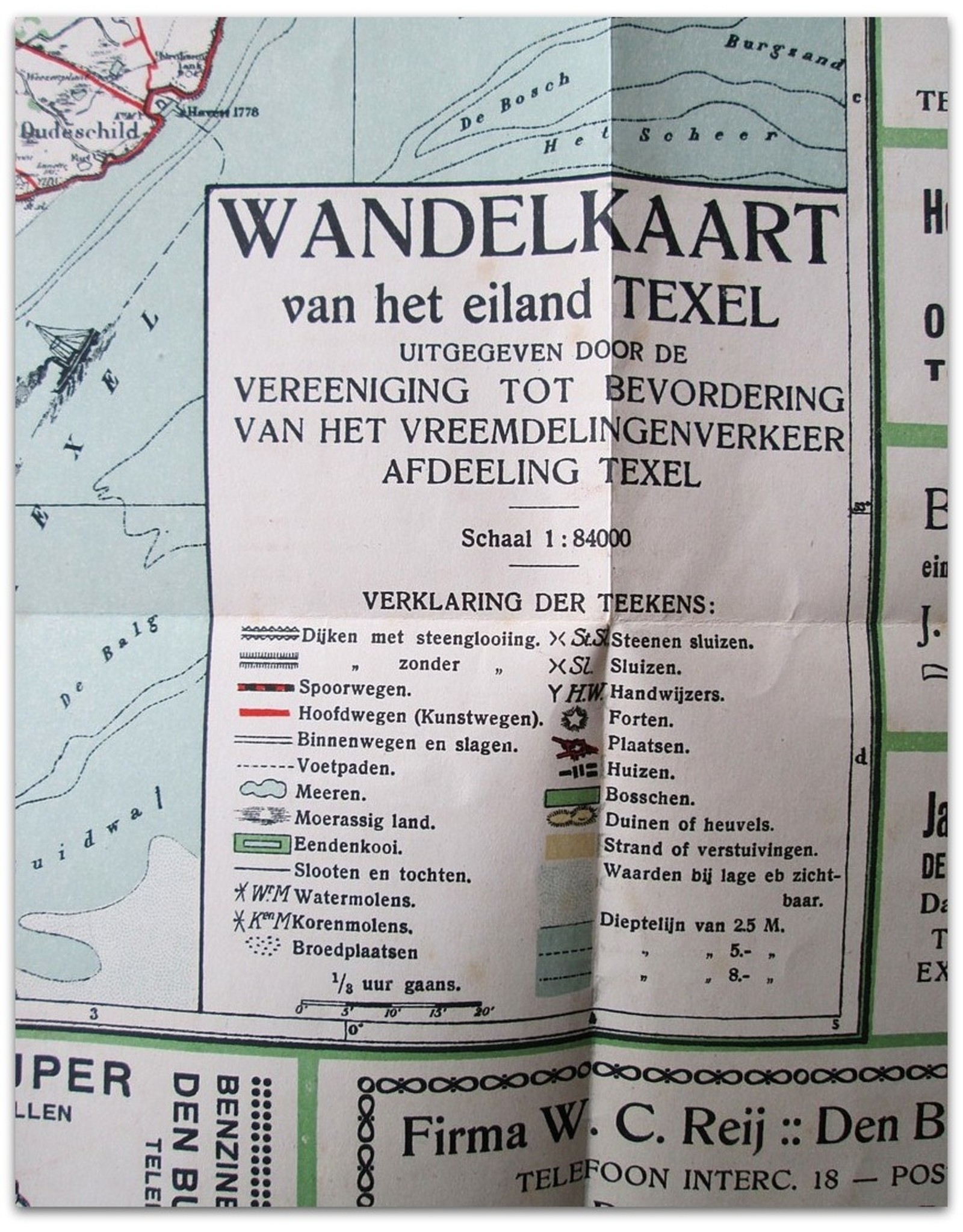 Uitvouwbare kaart van het waddeneiland op schaal 1 : 84.000; een gekleurde steendruk (41 x 49,5 cm), omringd door reclame en advertenties voor Texelse bedrijven en winkels. Bevat ook een kaartje van de Ontginning Staatsboschbedrijf "Westermient". 1:25.000.